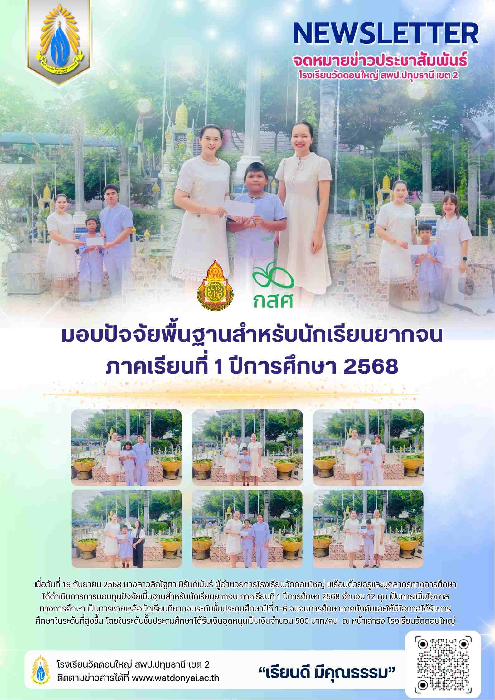 เมื่อวันที่ 19 กันยายน 2568 นางสาวสิณัฐตา นิรันด์พันธ์ ผู้อำนวยการโรงเรียนวัดดอนใหญ่ พร้อมด้วยครูและบุคลากรทางการศึกษา ได้ดำเนินการการมอบทุนปัจจัยพื้นฐานสำหรับนักเรียนยากจน ภาคเรียนที่ 1 ปีการศึกษา 2568 จำนวน 12 ทุน เป็นการเพิ่มโอกาสทางการศึกษา เป็นการช่วยเหลือนักเรียนที่ยากจนระดับชั้นประถมศึกษาปีที่ 1-6 จนจบการศึกษาภาคบังคับและให้มีโอกาสได้รับการศึกษาในระดับที่สูงขึ้น โดยในระดับชั้นประถมศึกษาได้รับเงินอุดหนุนเป็นเงินจำนวน 500 บาท/คน ณ หน้าเสาธง โรงเรียนวัดดอนใหญ่ |