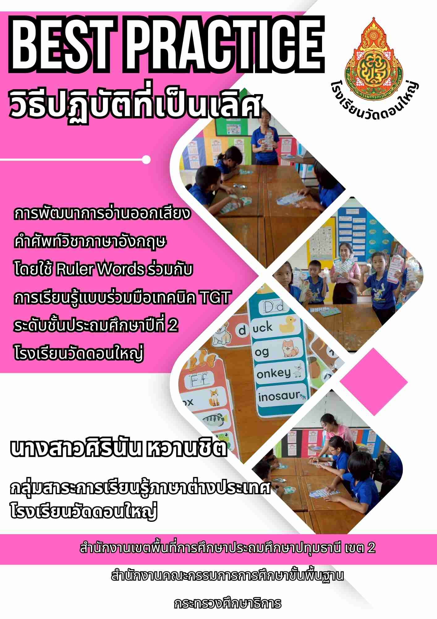 ชื่อผลงาน : การพัฒนาการอ่านออกเสียงคำศัพท์วิชาภาษาอังกฤษ โดยใช้ Ruler Words ร่วมกับการเรียนรู้แบบร่วมมือเทคนิค TGT ระดับชั้นประถมศึกษาปีที่ 2 โรงเรียนวัดดอนใหญ่